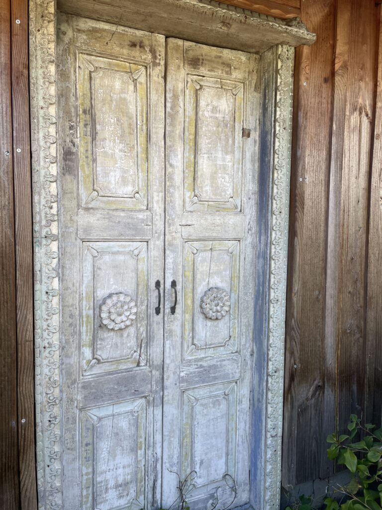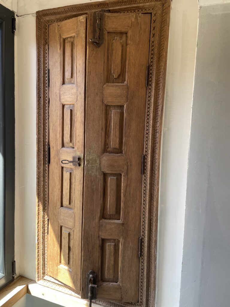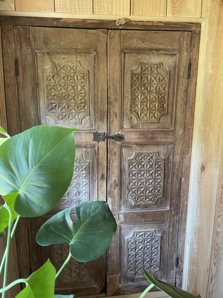 Des éléments d’architecture anciens réintégrés dans un espace contemporain. Une porte sculptée posée comme une oeuvre, une fenêtre ancienne intégrée dans une paroi de douche, un morceau de bois chiné qui devient l’âme d’une pièce.